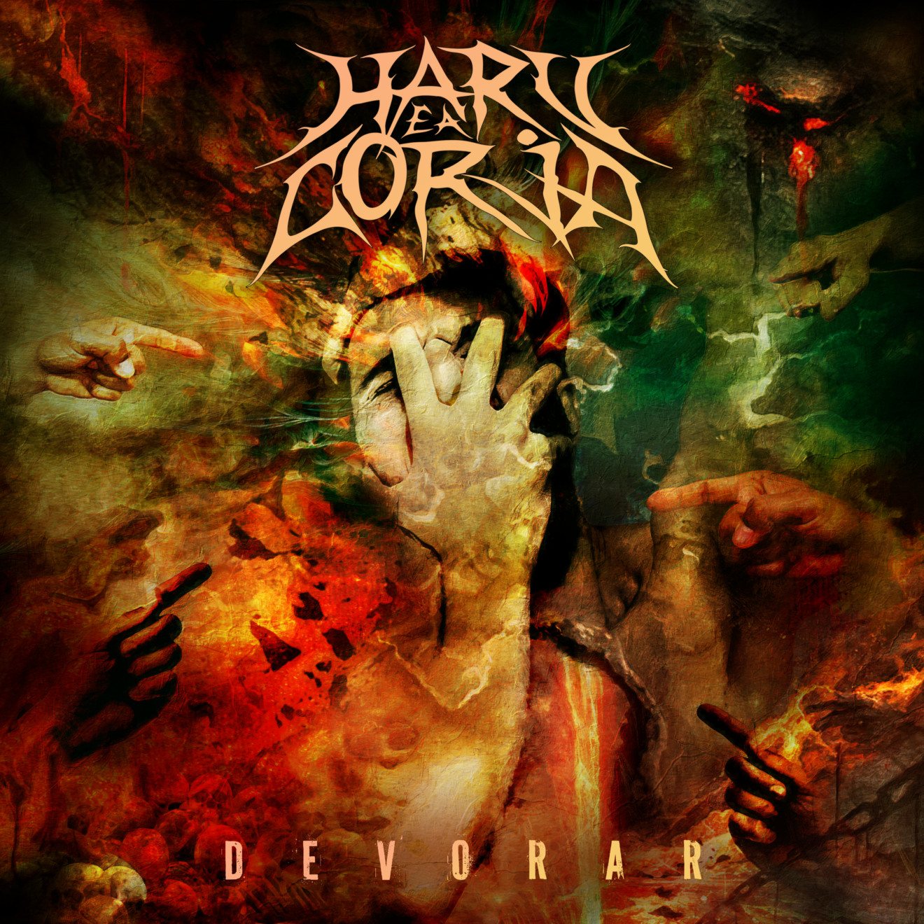 Haru e a Corja começa com “Devorar”, single que chegou nesta sexta-feira (17). A música avança engolindo o mundo com seu cruzamento entre metal moderno e hardcore já antes praticado pela banda, cujos pilares fundamentais de construção continuam com o baterista Silvio Romero e o baixista Pedro Leal além do mais recém chegado, o guitarrista Helder Jackson.