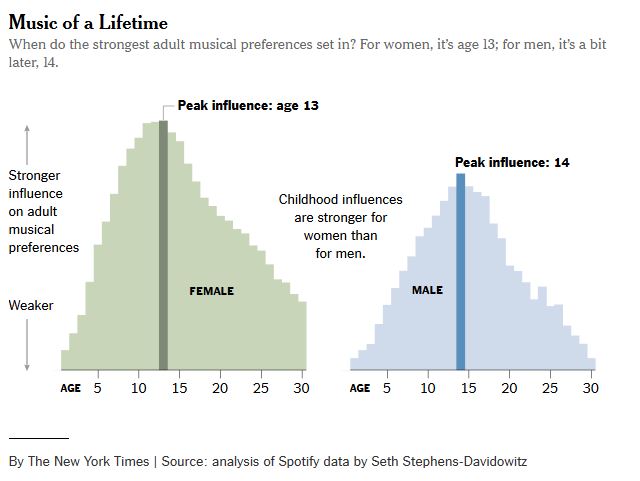 A análise ainda aprofunda e acrescenta que, para mulheres, o período de tempo mais relevante para formar o gosto musical começa aos 11 e vai até os 14 anos, já para homens começa e acaba um pouco mais tarde, dos 13 aos 16. Ou seja, é muito possível que as músicas que você ouve durante esse período te acompanhem pelo resto da vida.