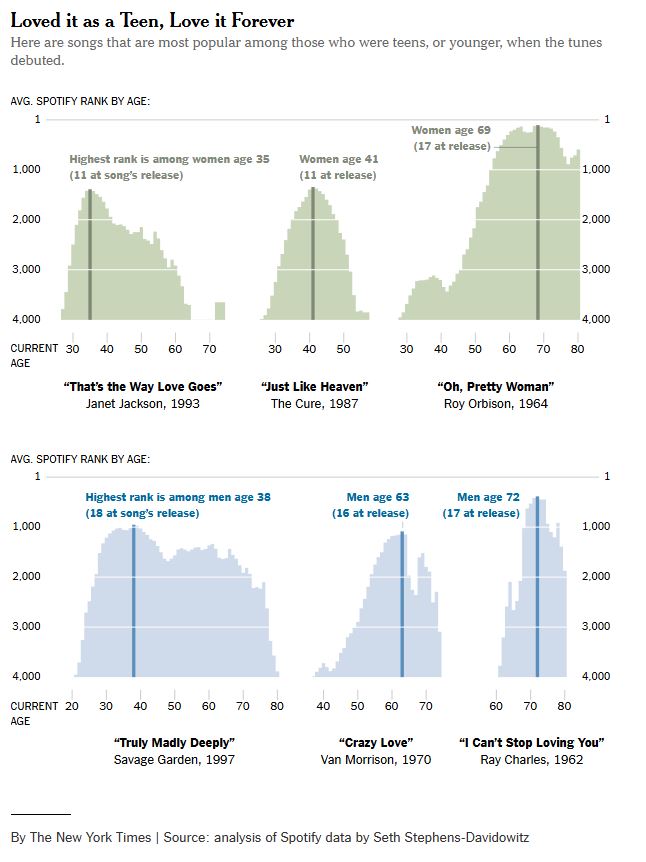 Em gráficos, que você vê logo abaixo, o jornalista ainda citou outras músicas como “Just Like Heaven”, do The Cure, adorada por mulheres de 41 anos e que tinham 11 na época do lançamento, em 1987.