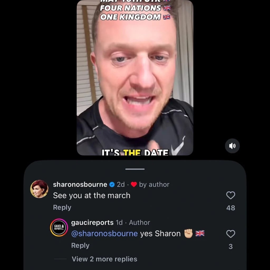 Em meio a essas declarações de Tommy Robinson, Sharon Osbourne, que morou nos Estados Unidos por décadas antes de retornar ao Reino Unido recentemente, comentou na publicação do ativista de extrema-direita: